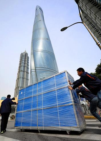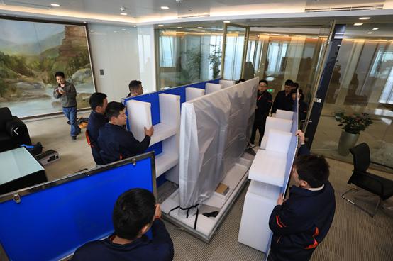 樂(lè)視120吋電視uMax120進(jìn)駐上海中心裝有樂(lè)視uMax120的藍(lán)色貨箱被售后人員推向上海中心大廈(上海中心一座超高層地標(biāo)式摩天大樓,建筑主體為118層,總高為632米,是上海第一高樓,在世界排名第四)。