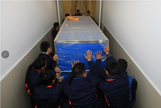 這么沉的貨箱十幾位售后人員齊心將其運(yùn)過(guò)狹窄的通道,在通過(guò)安全門(mén)的地方最高處和貨箱間的縫隙還不到一拳的距離,這種作業(yè)也絕對(duì)是厘米級(jí)的了。