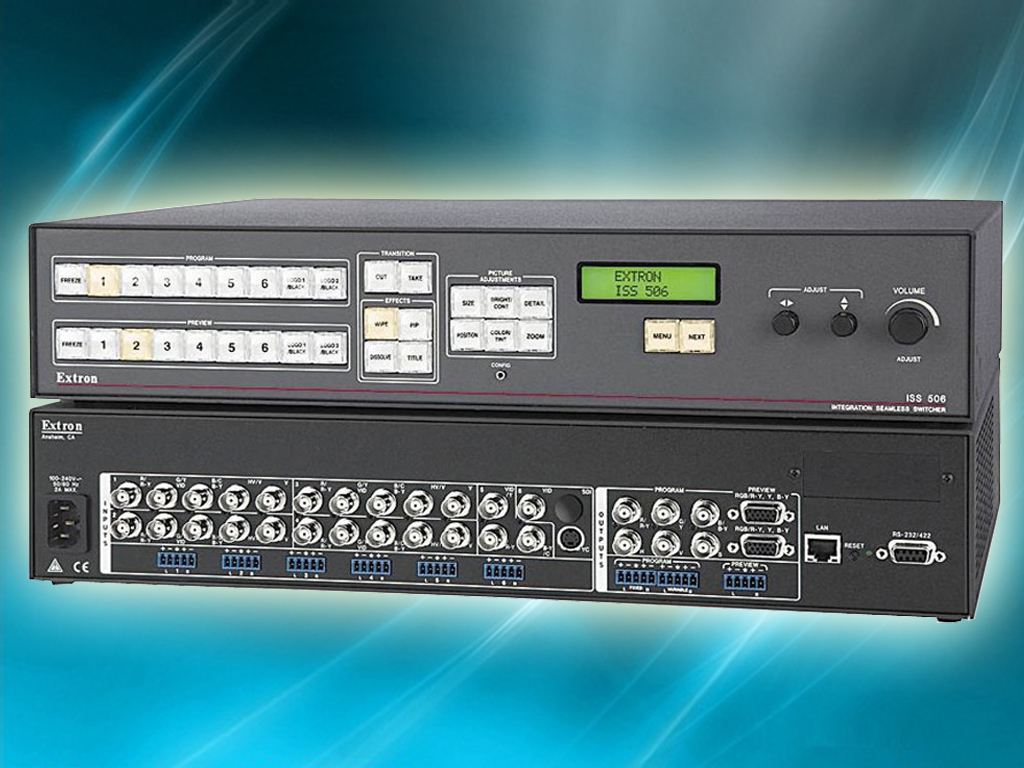 ------用于不同輸入信號(hào)源間的專業(yè)過(guò)渡,ISS 506提供了各種特效,包括在可選持續(xù)時(shí)間內(nèi)的溶解、劃變以及硬切等。如果切換中包括音頻信號(hào),可采用音頻交叉衰減來(lái)配合視頻過(guò)渡特效的持續(xù)時(shí)間。
